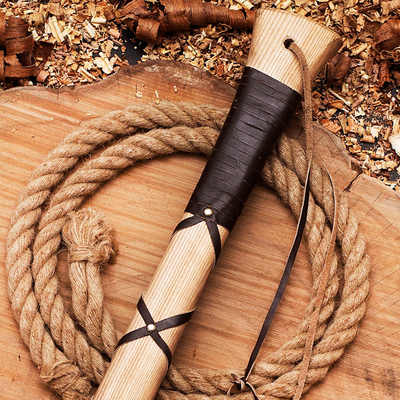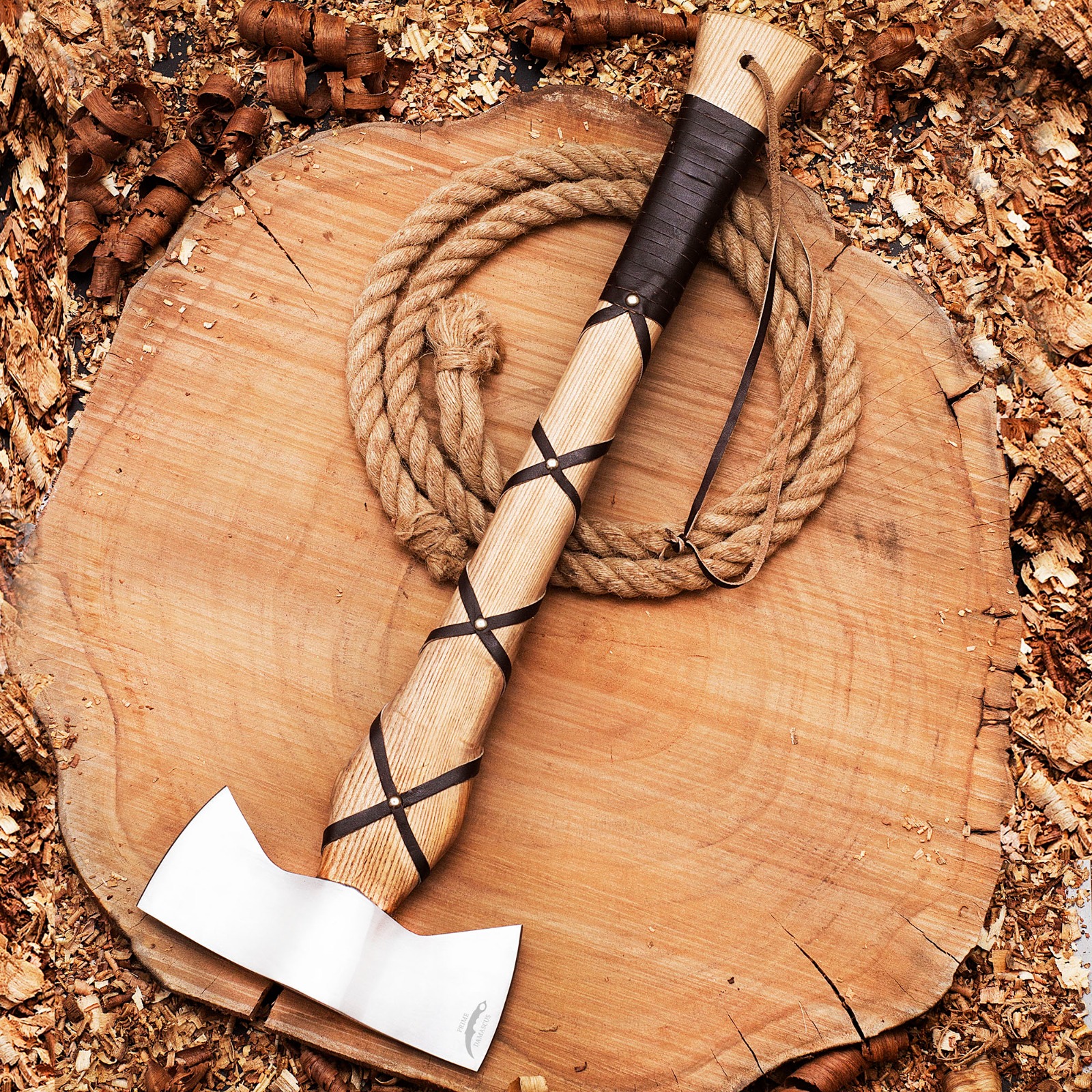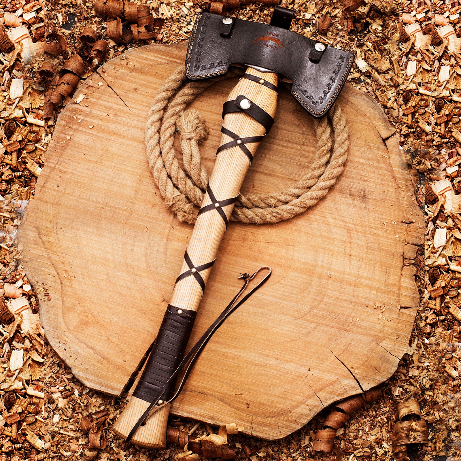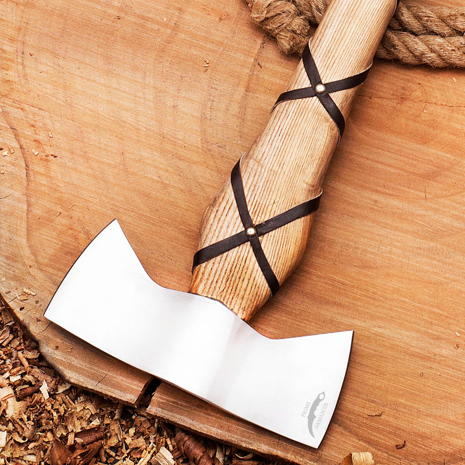 Handmade Hatchet Axe by Prime Damascus with 8″ head, 24″ ash wood handle, and razor sharp 5160 spring steel blade. Leather-wrapped back for durability.