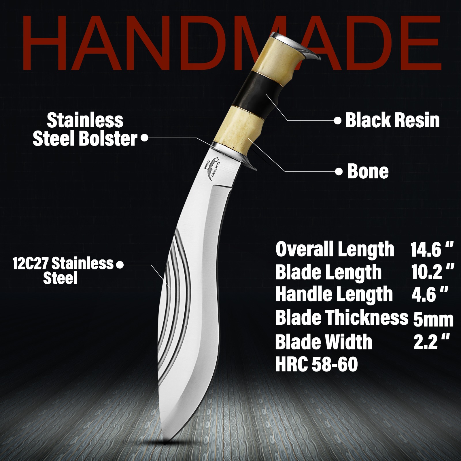 Kukri Knife – Handmade 12C27 Stainless Steel Blade with Camel Bone & Black Resin Handle | Prime Damascus
